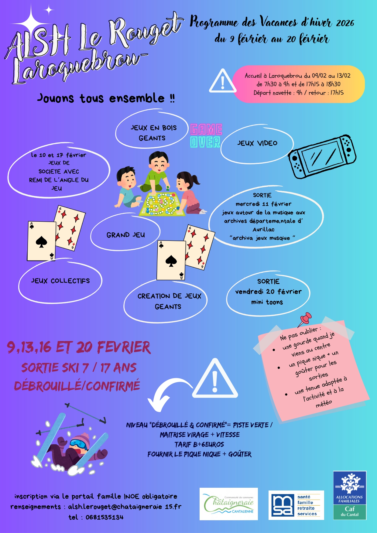 Découvrez les programmes des vacances d'hiver du lundi 09 février au vendredi 20 février pour l'ALSH de Le Rouget-Pers - Laroquebrou.